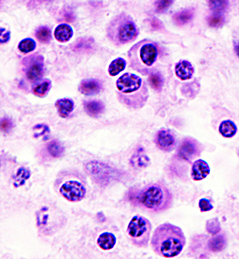 They are spherical or ovoid cells, whose cytoplasm is usually basophilic due to the presence of a large amount of ribossomes. They cells actively synthesize and secrete large amounts of proteins many of them—immunoglobulins of various classes, also generically called antibodies. In the image their cytoplasm becomes highlighted in light gray collor after you move or click the mouse.