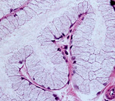 Three secretory cells become highlighted in blue-violet after moving the mouse or clicking. The nuclei of the secretory cells are elongated and appear to be “squeezed” against the base of the cell. They stain strongly with hematoxylin because contain mainly condensed chromatin. Some nuclei turn red when using the mouse or clicking.